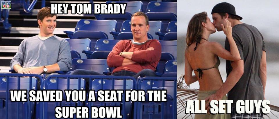 "Meanwhile at the Manning house" Anyone see the updated one with the 2 manning brothers and the caption "He Tom, we saved you a seat" :buds: |