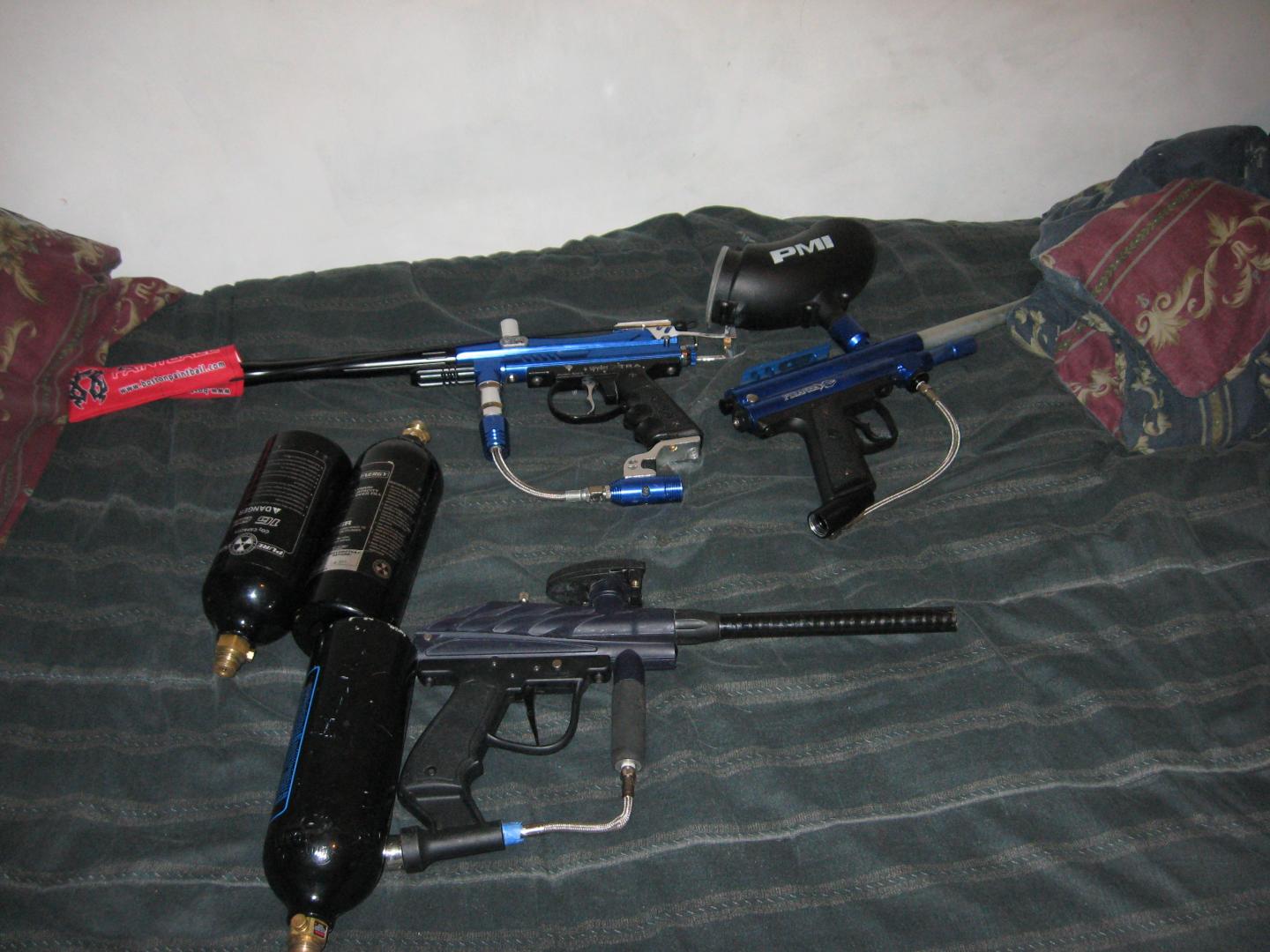 i have the following, -Spyder Xtra blue and silver - Piranaha blue and silver -Brass Eagle purple/black also have three tanks and three masks. and three vest looking for 175 for all delievered/picked up in rhode isand Attachment 43469 Attachment 43470 |