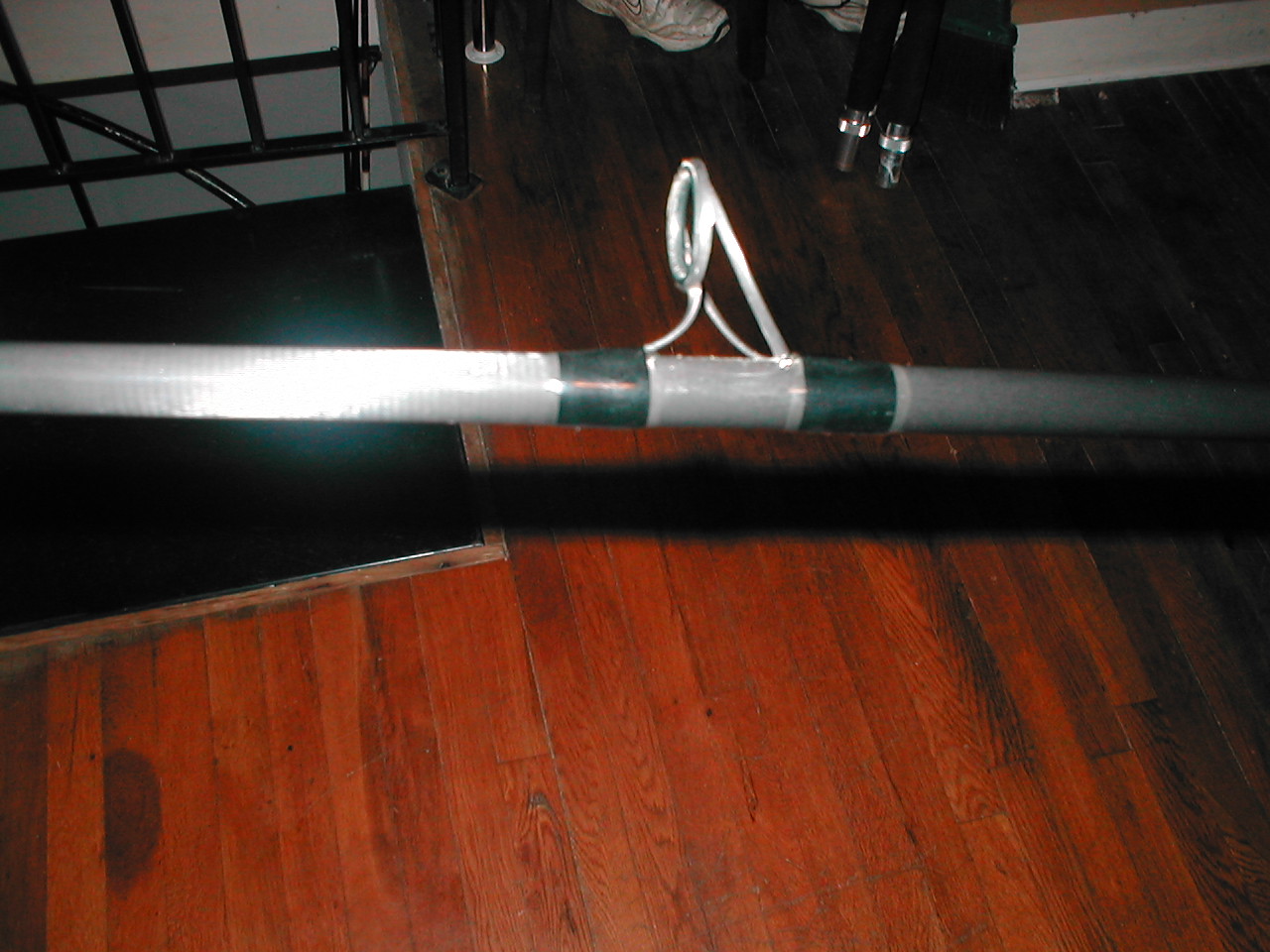 -------------------------------------------------------------------------------- Built by Rapt tite,Mike Joyce.It's 11 ft,one piece wrapped conventional.It's black on black,very plain Jane,except for the Jolly Roger. Due it's length,I will NOT ship.I do NOT have a paypal acct. This rod has never been fished,and it shows.I test casted it a half dozen casts maybe,on one outing.I should have gone with a heavier blank,but I didn't know.Twenty one and a half inches to center of reelseat,fiftysix to the first guide.Looking to get almost what I've got into it.$250,picked up,or met locally.Thanks for looking. Attachment 43596 Attachment 43597 Attachment 43598 |