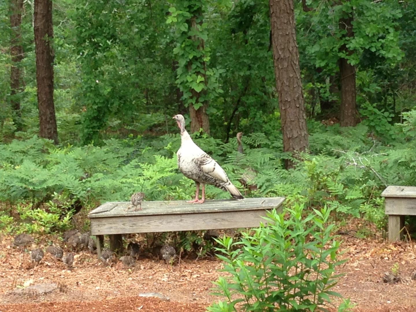 it was checking out the whole set up hoping from one to another.... i had placed a partial bag of sunflower seed in the wheel barrow and it absorbed some rain water unfortunately causing a good portion of it to sprout, So having already purchased a new 50lb bag of smaller higher quality black oiled from south dakota i dumped it (the old one) over the chain link fence. tonight to our surprise our old friendly turkey (a male) was over there 30 feet from the office window stuffing his crop .... with much pleasure. |
