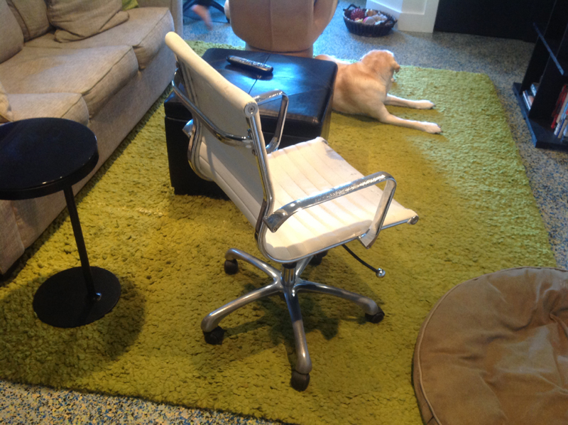 Small scale Eames style in white leather. It was 350 or something new but cosmetically it didn't hold up well. Heavy for its size. Mechanically it's fine and it's comfortable. Would make a good shop chair or something for the garage.