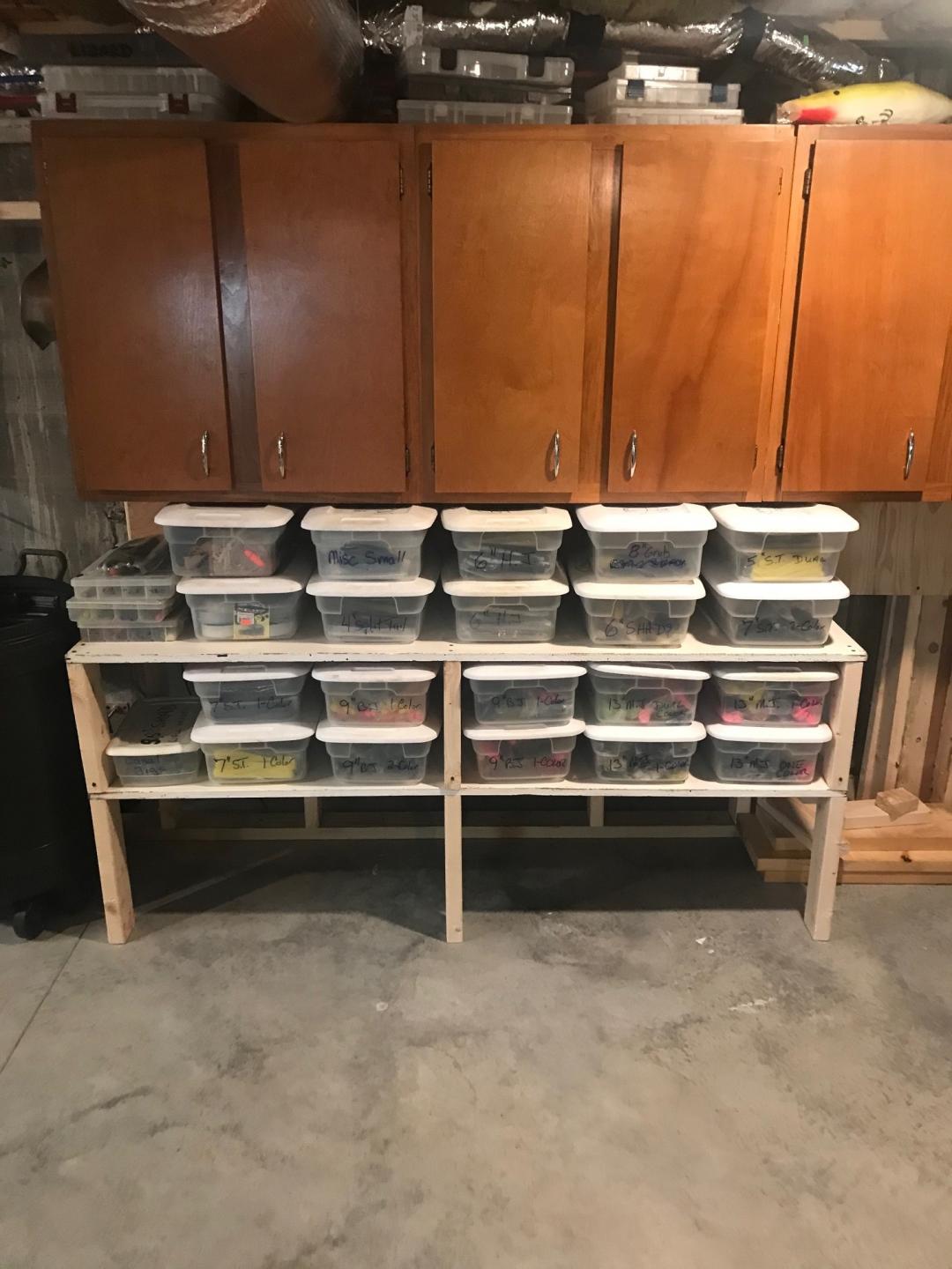 The cottage rebuild is complete, hopefully occupancy permit this week, but it is nice to finally have a basement and a place to consolidate fishing and tools previously crammed in a shed. Two years of no flea markets really sucked, as you can see I'm still loaded with a ton of Ledge Runner Bait plastic, the lions share 13" and 9" jerk baits and 7" and 5" split tails. All the usual good colors and 2008 MSBA show pricing was $14,