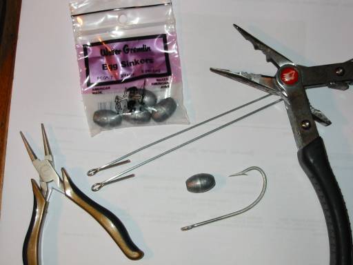 here is what is nooeded. pliers, round nose pliers, some egg sinkers, wire (I used the 12" preformed from NJTackle), and a hook. that is an open eye 8/0