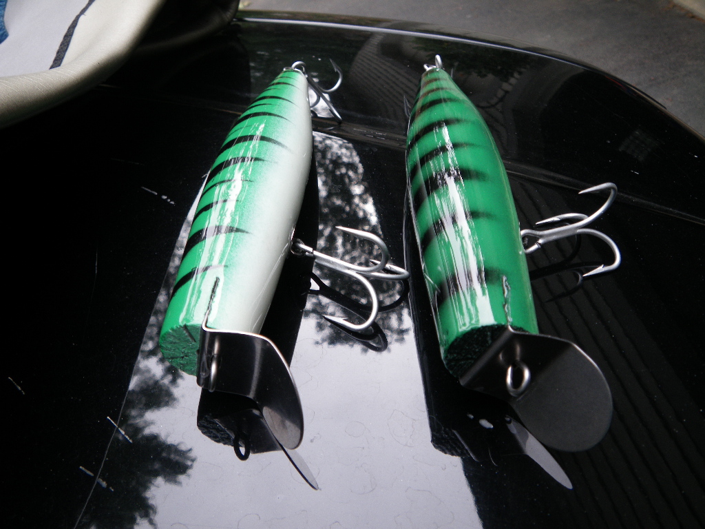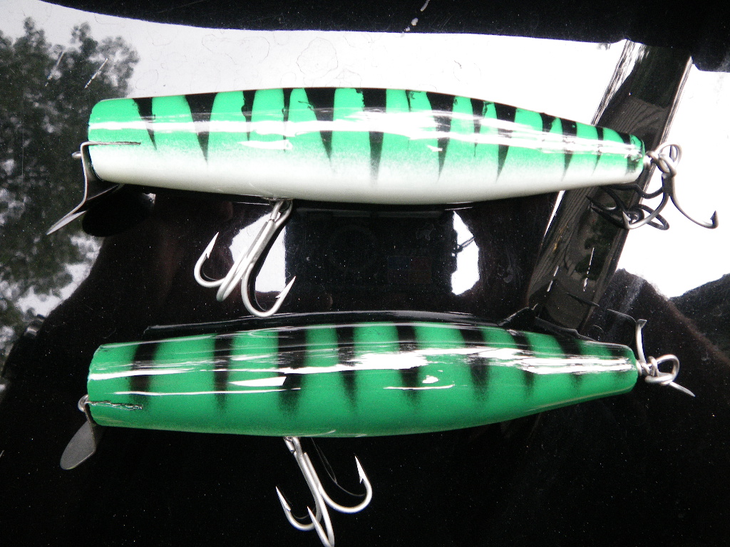 Been going at it pretty good lately...fishing time has been limited(wife's fault ) so I've been down in the cave making plugs...some good stuff to follow... these are a couple musso pine jr's I just finished: