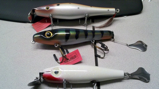 Mike just dropped off my plugfest raffle winning plugs..wow. Whoever picked these out did a great job. Angler229, Muskeyslayer and ?? not sure who made the white one. All three are amazing , thank you for donating and picking these out for us.