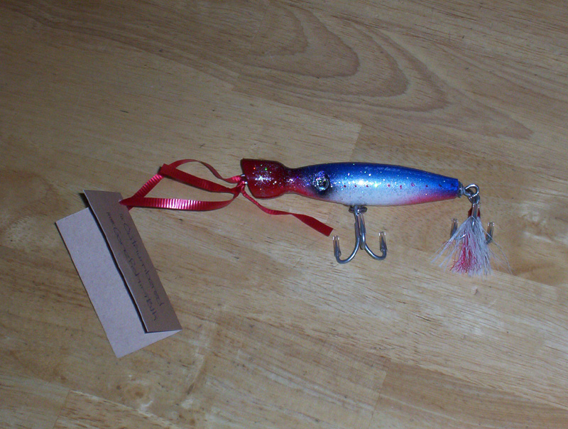 A Backbeach Jake Pencil Popper! Pearl white with a touch of fogged pink down the sides! It's the first ornament on this year's tree! The wife liked the way it looked so much that she suggested we do the tree with just plugs this year....