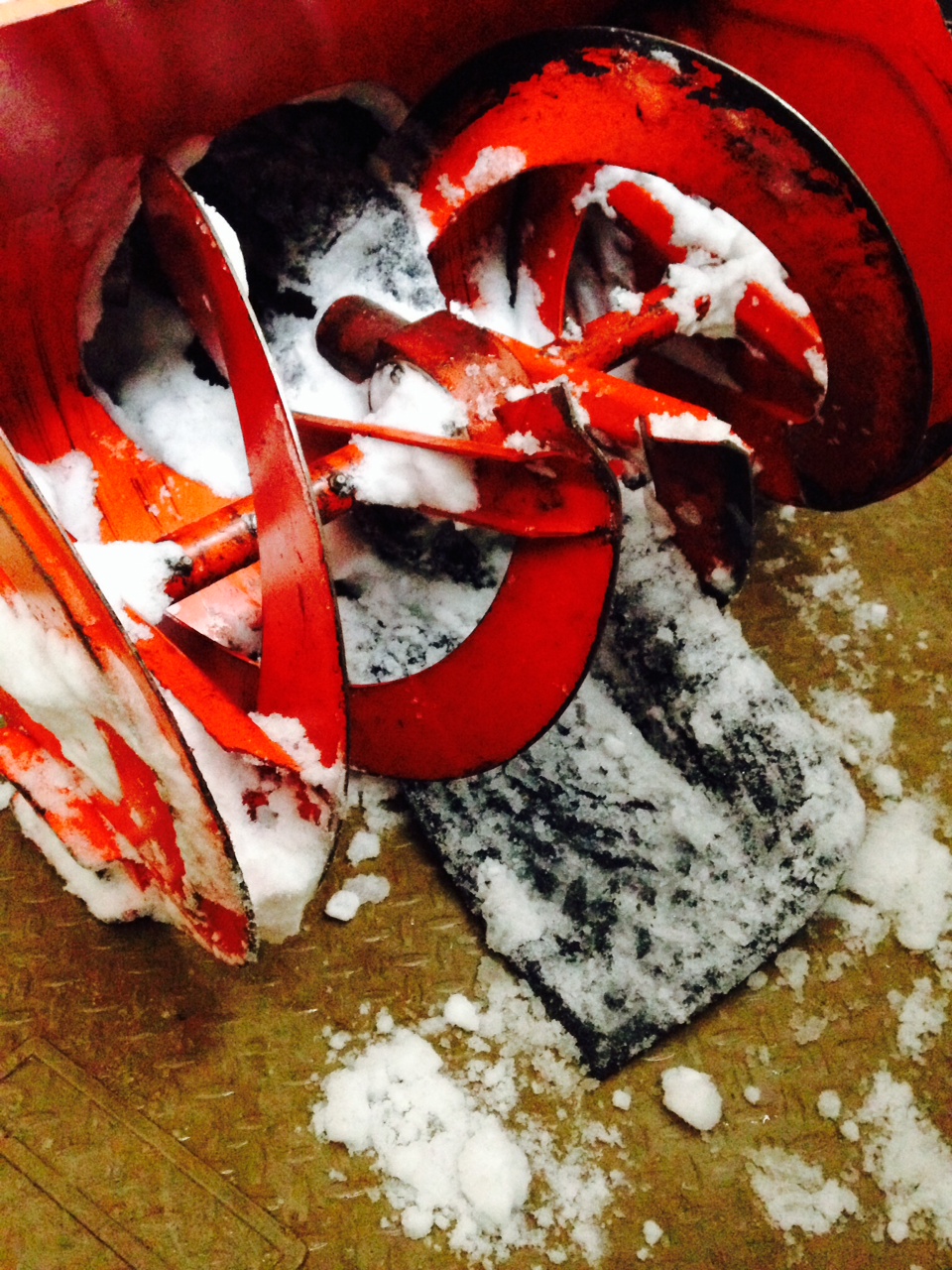 Well, got that cleared out... Pulled wire off spark plug. 2x4 to spin auger. I did shear pin on one side. Used the white serrated bait/netting knife to cut the mat up, which was the key tool. Replaced both shear pins. All told, half an hour, after thawing it for 3 hours. No way I would have gotten that removed outside. Back at it tomorrow as I have to make room for another 12-18 we are forecasted for here starting Sunday.