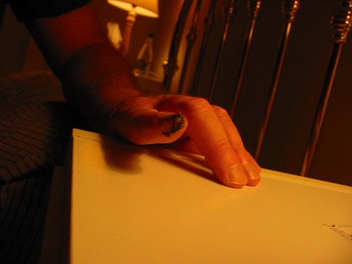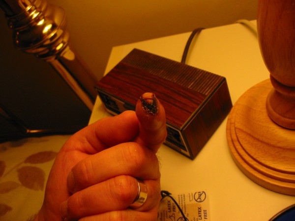 OUCHIE sorry my friend. Last year I was cutting a piece of stock on the table saw and I dropped it on the floor. I tried to bend over to pick it up and I got a terrible shooting back pain and started to fall. So natural reaction was to stablize by reaching for the table saw...... oops bad reaction took a chunk of thumb off. thankfully they sewed it back on: I can still type