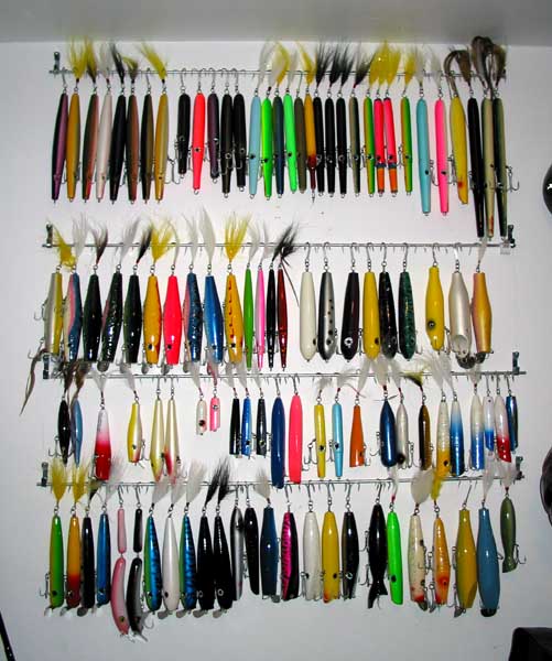 bigfish... Goosefish has a neat plug rack that doesnt mount to anything. Its basically 2 slats of wood about 7 feet high with slats like ladder rungs every 12 inches- he leans it up agianst his wall and the plugs hang from the rungs-