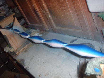 (Ive done it several ways. I have put the epoxy on an spin it around with my fingers a bit an hang em take a few minutes an turn em then turn em againComes out ok u gotta wrk with how long between turnin em to get em nice an sometimes i get some spots the epoxy won't move to.I made a wheel my friend used to do em like this he showed me the wheel an i shared it with the guys on the other site yrs ago.i used a pail lid for a template an screwd 2 pieces of 3/8 ply together an cut em out with a jigsaw then i spaced the six small 1/16 holes around the perimeter.an installed hook screws made a hole in the center.an took the screws out installed the 2 pcs on a threaded rod wit nuts an bolts 1/4 rod makes it more adaptable to the motor assembly.keep the pieces about 16 inches apart.This way works ok but i like doin em inline like bm does I put a drill chuck on the motor an hook 5-8 finished plugs together with small s-clips i make outof the wire scraps.clamp it to the table an hook it to a board in the vise with a hook eye an a sampo swivel.I like this way best u can look at what ur doin I use a halogen lamp.Ive made some perfect plugs with this technique. but i gotta get a new motor the old one crapped out an the rod dryin motor i got won't work with the tension on it.BM posted some motor info high speed motors with some kinda reducers.Where do i get that stuff.i think 6 rpm's is a good speed.