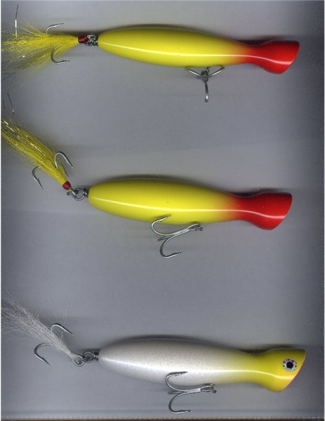 Those are the best looking poppers I have ever seen! Your killin me over here  The color and pattern choices are PRIMO! Excellant job on the tails as well. I need all the specifics though. Whats the weight? What are they made out of? How did you get the faces cupped so perfect? What clear finish are you using?