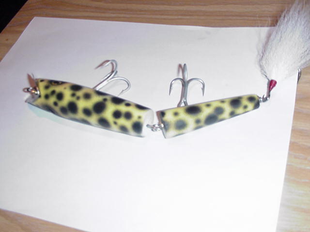 While down in the plug lab messing around with some mis-drills people have sent me I found this blank in the pile. I am not sure but think it may be a Back Beach Jake blank. Since I am old school oriented I thought this would really look old school if I made the swimming plate (lip) attach to the front etc and make it jointed. I think the blank was supposed to be a Pencil Popper. Anyway, I need to figure out the weighting still. It needs some more drilling for eyes and sealing plus a little glue on a slight crack on the tail end and then screw the plate in place.