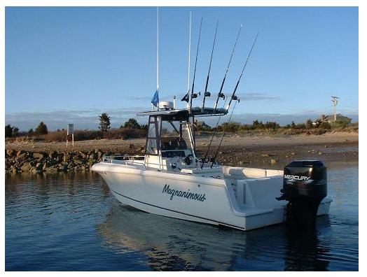 !997 Bluefin CC 25 ft. The boat has a 1997 Merc. 250 EFI that has been maintained by Nauset Marine, and the engine has about 570 hrs. The boat comes with all the following. Furuno 1850 color GPS (04) 16 mile Furuno Radar (02) and a Furuno 600 Color Fish finder. T-Top with CB, VHF, Stereo, Leaning post with backrest and 4 rod holders. Porta potti in the center console, bow pad, live well, salt water wash,sink in the transom,240 qt. fish box , built in cooler seat ,94 qt cooler under leaning post. Full canvas around the center console that pulls out into wings, toe rails, rod holders in gunnels (3 each side) The boat has a 8.2' beam, 125 gal. of fuel. She cruises at 3800 rpm diong 30 mph.and tops out at 52 mph, also has SS prop. Burns about 10-12 gph. Boat is in mint shape and I you want to see photos please go to www.magnanimoussportfishing.com or www.goose.com and then to Marine sales or I can email you what I have. It also comes with a Karavan dual trailer. the price is 28,000 dollars or best offer. I do have all the records from Nauset Marine and the electronics were put in by Land -Sea Comm. Phone 508-430-8045 / 774-353-6132 or email Magnanimous@comcast.net Thank You Mark
