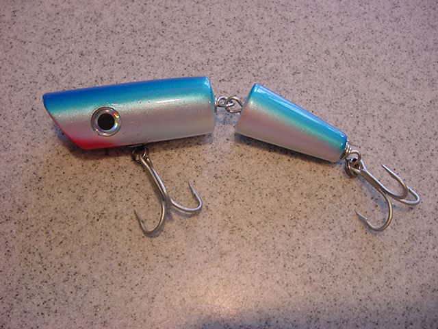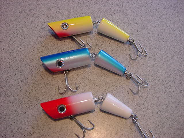 As these were drying I was inspired by BigFish's jointed poppers. So I gave it a go. Again, really pleased with the outcome. They weigh in around 1.75oz and are around 5.5". They sure cause a commotion in the water. We'll see if the fish like them. I'll tell you, I'm really addicted. Looking forward to starting the next batch.
