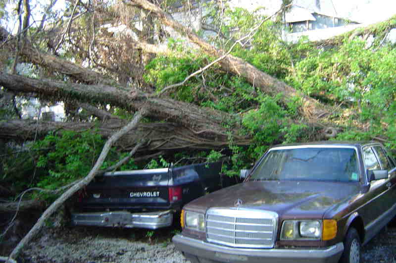 But they didn't miss the cars... The big old Chevy only had a back windows popped out and basically kept it's shape. Good to know how safe it was. The brown Mercedes ran on biodiesel and the motor crapped a week before they evacuated. Joke's on the person who tried to hotwire it!