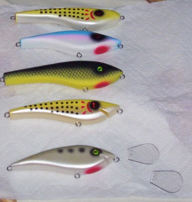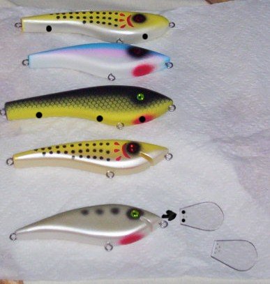I tried some more handcarved and tried different weighting on the type that I posted last time. I also tried some "gliders" and I have no idea if they will work. I also tried my own shape(bunker painted) to see how it goes. I still have to clear them and glue in the lips before I can test them but they should do something in the water. Hopefully I can get to them soon, but with Christmas and all, who knows? I'm liking this carving thing a lot! Now if I only had a decent airbrush...