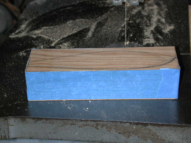 Clean up on a belt sander, and draw centerlines top and bottom and lay out parallell lines each side of it to mark the desired top and bottom widths..............sorry lost that picture but I think it is self-explanatory. Next I make a side pattern determining the shape that separates the top and bottom half of the plug and draw it on each side. This will act as a guide for how far up the side of the plug you want its max width.