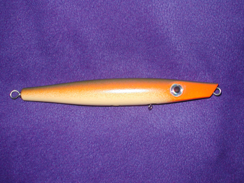 Weighs 2 ounces without hooks. About 7" long. Soft yellow belly, orange side and a metallic olive back.... Gettin' the hang of these rattle cans now....