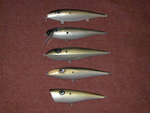 Meet the Bunkers. Fooling around. Started with a profile I liked, then used it to build several type plugs............A metal lip, plastic lip, glider, darter, popper.........tested 'em, tweaked 'em.........and here's what I got............the Bunker family.