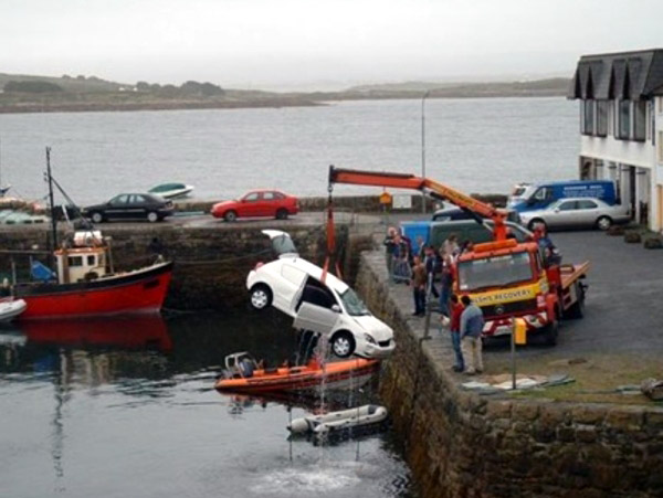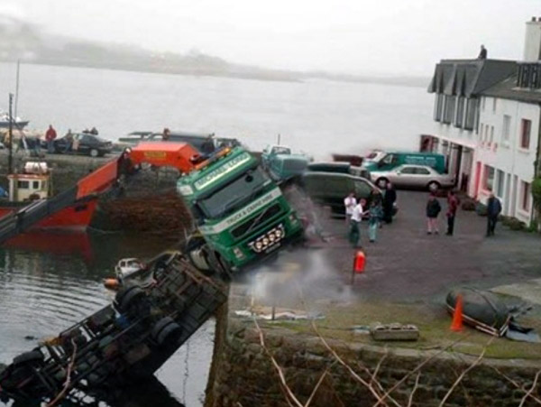 The first one is real,because he didnt use any outriggers at all and he miscalculated the weight of the minivan WITH water inside. the 2nd and third are photoshopped ,look closely and you can see the size and distance doesnt match.