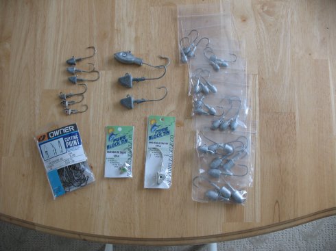 Best part of this lot is the Pro-Pack of 5/0 Owner Salt Water Jig Hooks, which is a 33 count pack. There are two 3 count bags each of 1-1/8, 3/4, 1/2 and 3/8 Kalin Ulimate Jig Heads, a some misc. swim heads. The Pro-Pack is worth $22 on it's own, so lets say $30 for the lot and you pay shipping.