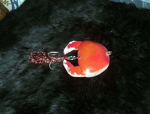 2 .3/16oz weights in bottom. I cut an ANGLE on the BOTTOM for it to sit looking up. foam claws, 1.5 screw eyes an a 3/0 front hook.