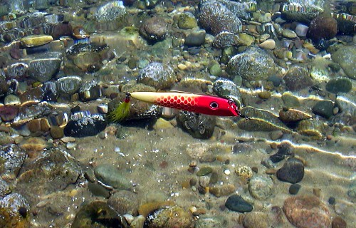 I took the SLAMMERS swimming,TODAY. here is a couple of pic's of them sitting in the water, thanks to NUMBSKULL for the info on them. I used BARREL WEIGHTS 2 of em, cast an swim great. now I going to do a few more in different colors.