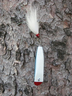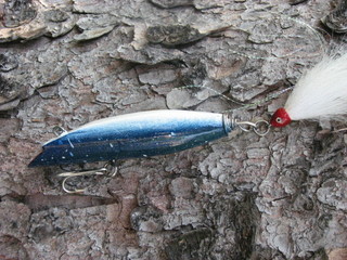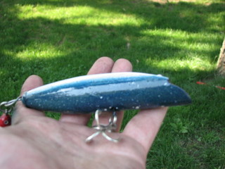 Ya know, it's definitely beautiful, but one thing kinda bothers me. Blue and white is a great color combo, but in nature, fish use something called counter-shading to protect themselves from predators. Dark on top, so that they'll blend in with the bottom when viewed from above. Light underneath, so that they match the sky when viewed from below. Contrast doesn't necessarily hurt, but predatory fish sometimes are turned off by things that don't seem natural. It might work well, maybe it's just me, but I'd do one of two things with it. I'd either re-paint it or give it to the guy who is in the picture on one post with the upside-down reel. It'd match his outfit beautifully.