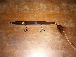 Every rosewood lure, all 3 that I've made so far, this 2 hook, a 1 hook, and a stubby, is individual and all hand made - no duplicator work, heavy wind on bar swivels, and tied with a furnace hackle tail - with the exception of the stubby needle I made for my Dad with a mink zonker tail  .