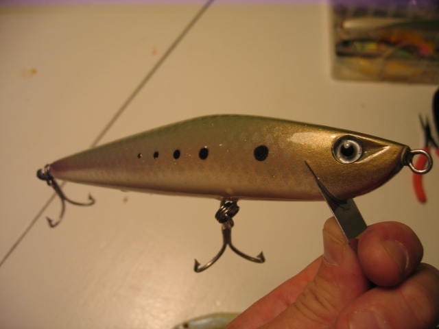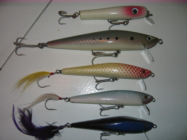 the little white sparkle one, doesnt show in the picture, but its solid blue shimmer for imitating small baits...the yo-zuris are there for scale as is the habs [rip] mullet....all hand carves. The big bunker is rock maple , the little one is walnut, the others mix of walnut, maple, basswood.