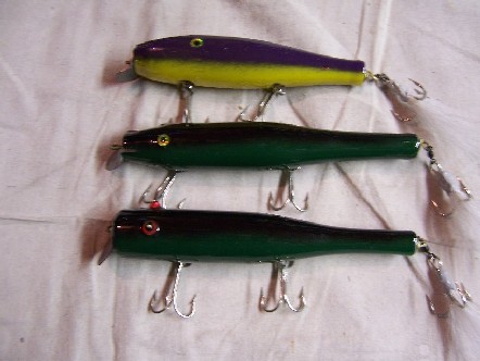 Next are a trio swimmers, made some time in the 90's,fitted with homemade lips, two out of the three have been refinished, the originals all sported bead eyes and were painted with good old rustolium and varnish, they all caught fish, none were fished again after refinishing....
