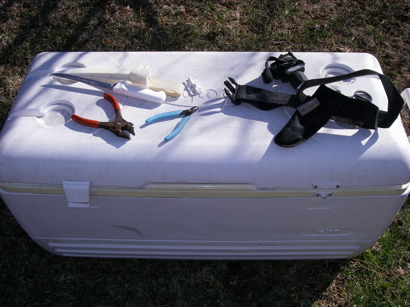 Big Igloo cooler, not sure how many quarts (41" long), xuron split ring pliers, manley 6 1/2" pliers, head lamp, dexter russell filet knifew w/ sheath (good edge), wading belt $75 for everything, come get it.