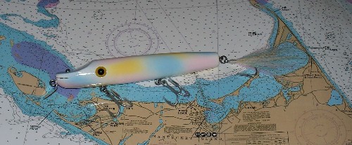 EXPERMINTAL PIKE, just had to do it try one 7.1/2 long (not a pikie lip) as you can see,don't have any YET. the eye is 1/2, guess it should be smaller, an the cut in the head might be to long, Im looking for some Red hooks at the R.I.show this weekend. added ss.screws on the top lip to make it look real. NO.2 is the same but WounderBread color, Hand Carved Rattle Can Painted, the next one should be better,
