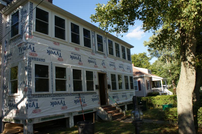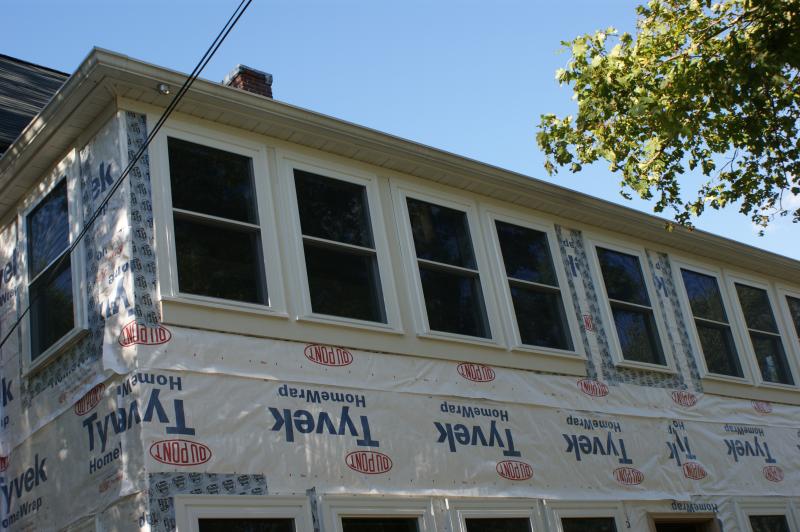 This is what the new is shaping up like. The siding will be white cedar impressions. We did this in two weekends , the first weekend we tore out the 3 exterior 1st floor walls, reframing and sheathing, then installing the windows and door. The 2nd weekend we did the same on the second floor, but I also reframed the floor and laid a new deck inside.
