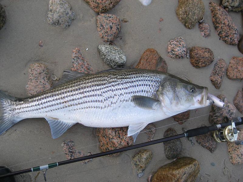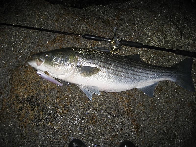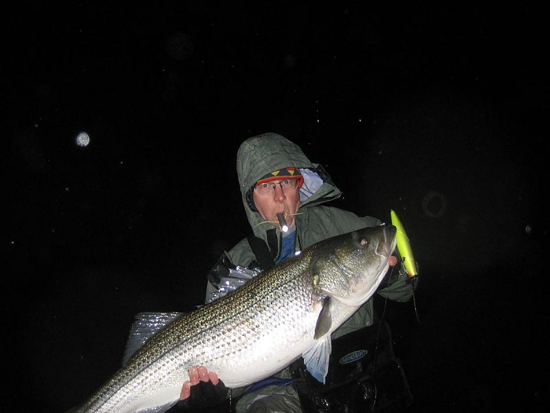 Feelin' good, lookin' stupid. Best shore fish for me in several years. 33lbs. Lg Donny Pine. Swims down about 3ft. Good rough water plug it seems.
