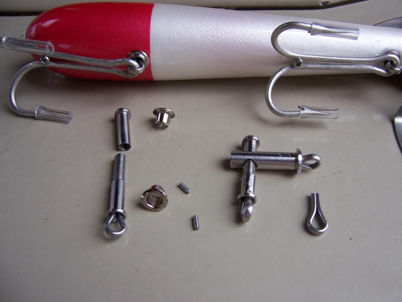 Ok my friend here you go. I wanted to use cotter pins like the original so to create the illusion I used cut cotter pins. I then pinned them into a bore which I threaded thus the bottom of the hanger. I then tapped the top part and rounded the head creating the illusion of the welded, solder, top part. The front grommet was done the same way with a hole drilled thru it to take the front hanger. It was a lot of fun to make and even more fun to give to Eddy. I have to thank VB, as it was his collection that inspired me to make the plug. I fell in luv with it as soon as I saw it. I thought insect at first and then black widow, thus the red hourglass. Thanks again for the accolades I am truly flattered.