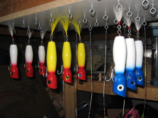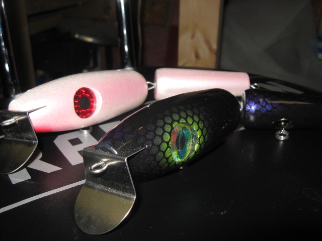 my shape with some classic colors. 5/0 siwash with bucktail and 2/0 trebles, all weigh about 2.75 ounces, cast a mile. krok swivels, #5 wolverine splitrings and 308 wire. Ready for plugbash! Pic of my first joints too...