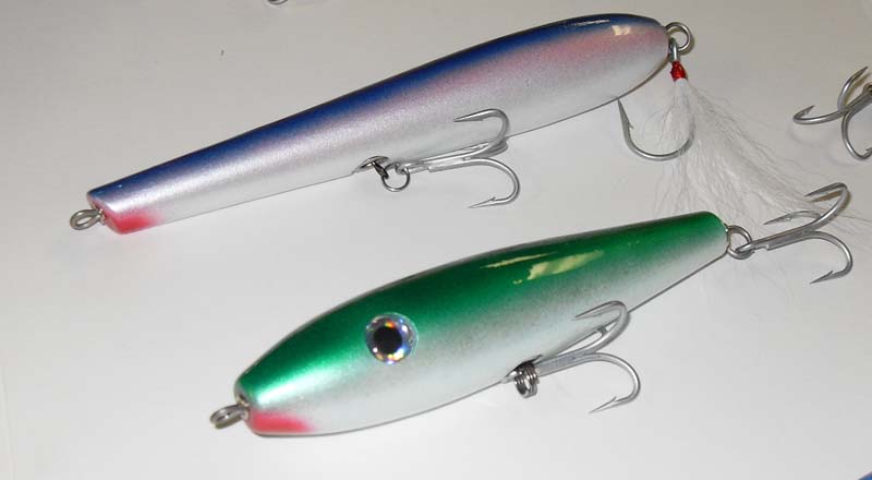 The pencils need to be tail weighted more, I would like them to sit more at a angle when there's no retrieve. Belly hook on the popper is too far forward, I messed up my first couple of popper mouths and i cut this back more. Danny's are MikeCC kits (should have left them blind  )