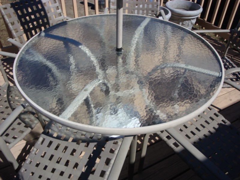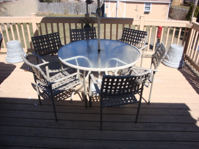 Includes glass table, 6 chairs and umbrella and base. Nice shape. PU in RI. ASAP $ 40