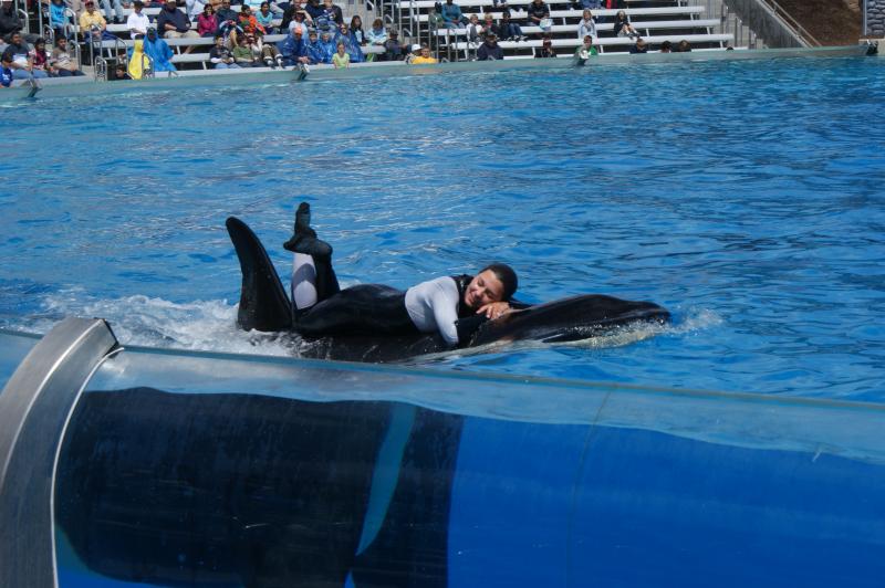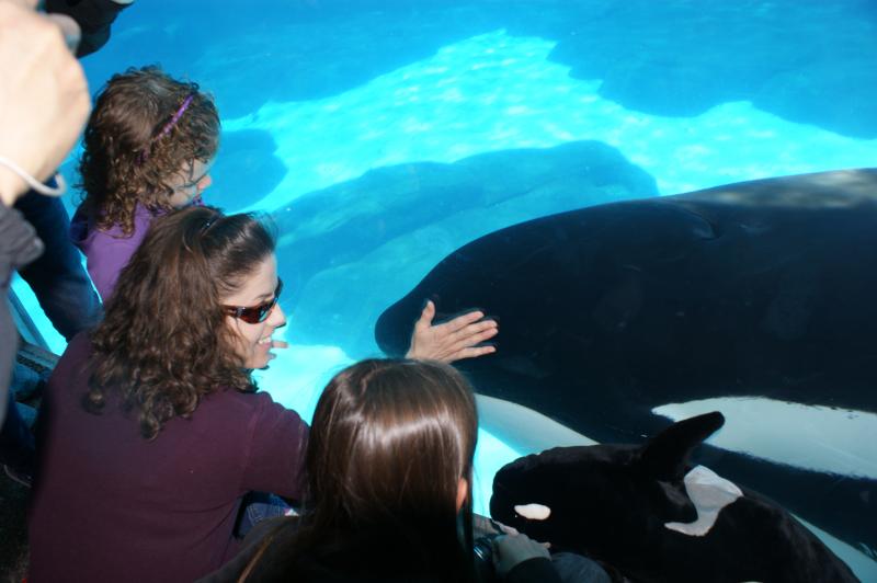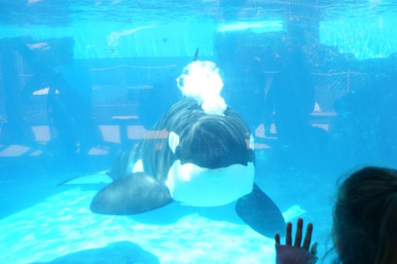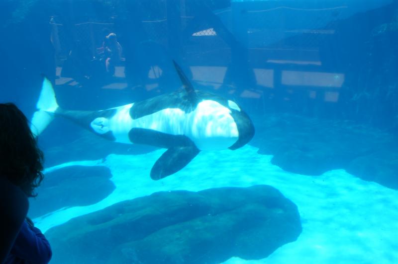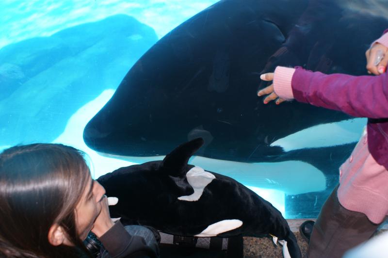 This whale was in a big tank behind the Shamu show. A woman who looked to be a pro photographer put her bag down, and then placed a 3' stuffed killerwhale on top of it. The result was the whale in the tank swimming straight at the window, and then siding up to it, getting eye to eye. It stayed there for a couple of minutes...