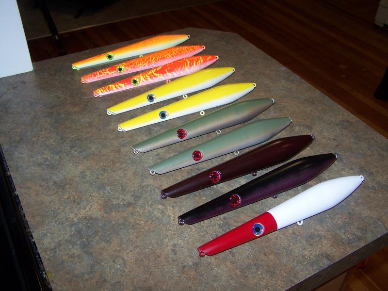 those are sweet  love crackle orange/yellow....what ya throwing them with  I don't paint the pvc plugs I turn... to me thats the benefit of useing pvc...no epoxy/paint/sealer...from lathe to surf in a hr...the stuff I got don't float as good as ceder...I seen a guy rip the plank down and with a table saw grove 1/2 a center hole on each side then glue it back together  and it was thru drilled  I'm throwing a lami sb12015m and a 7000bgh
