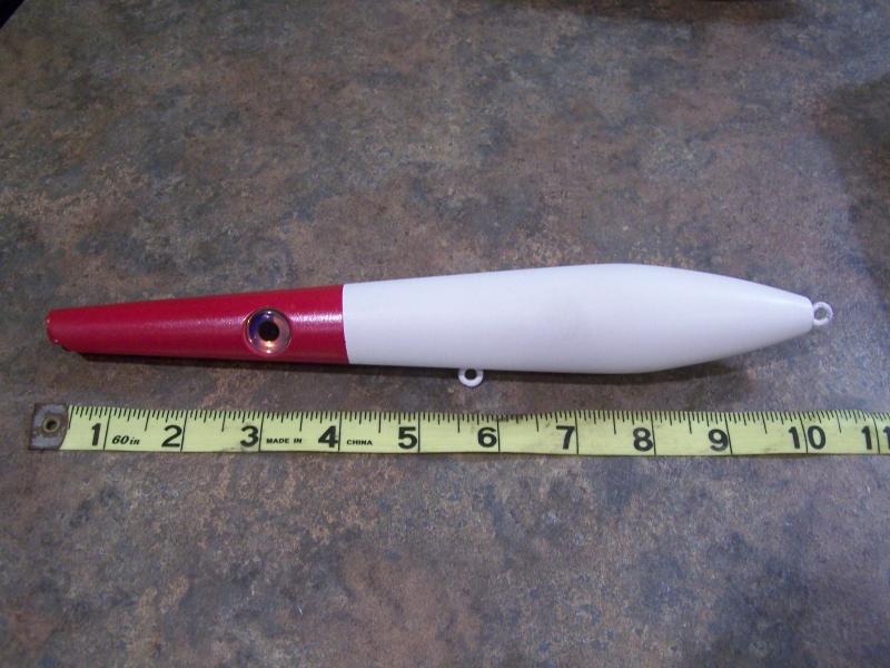Here are some pics of my 10" monster canals. They weigh around 5 ounces and should be rigged with 4/0 or 5/0 VMC Hooks. They're tail weighted and get a nice side to side action, they cast far with a little practice. Also they're constructed of solid PVC not wood.Let me know some thoughts. I played around with colors, Zuri is my favoite.