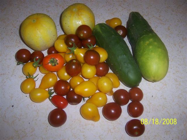 My yard is super shady so there is only a small space right up front at the edge of the sidewalk that get enough sun, so I turned it over early spring and planted beans (got two crops out of them kids had a ball picking them-sugar snaps were excellent), some regular green cucumbers that are excellent (crisp and full, a little light on the flavor though), lemon cucumbers (size, shape and color of a lemon-tast just like a regular cucumber), radishes that I might as well not have planted), and a variety of heriloom tomatoes (black cherry, yellow pear, orange sprite, patio princess, whitequeen, black zebra, purple calabash and several others). The smaller tomatoes have really done well in the ripening-very colorful and tasty. The larger tomatoes have not yet ripened-maybe this week with the wamer weather.