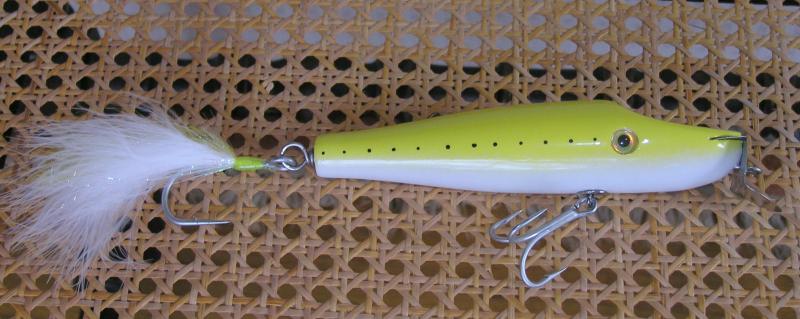 The finished plug weighs in at exactly 2.5 oz and has a 0.2 oz (3/8 diameter) chin weight and a 5/16 x 1inch tail weight. Cut 4/0 treble and I dressed a 5/0 Siwash with marabou, crystal flash, and yellow puglisi fiber.