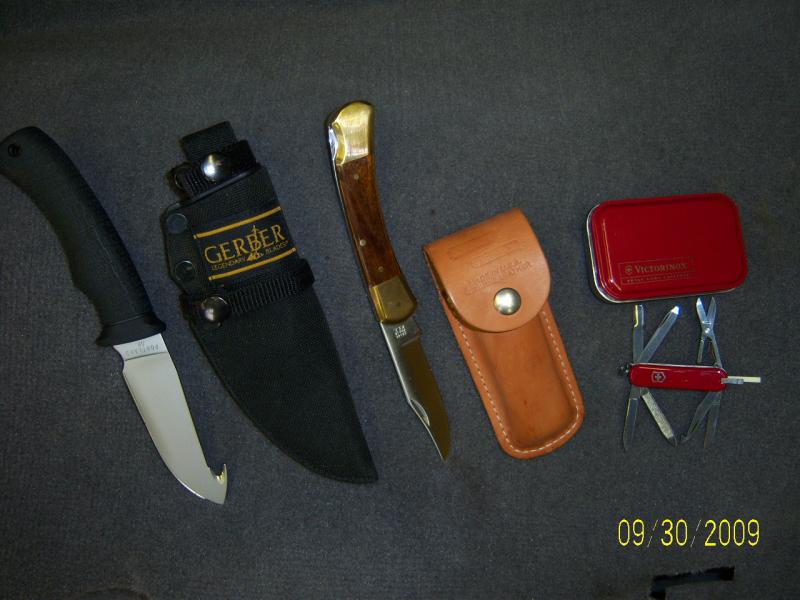 Gerber with sheath, Buck Type by Proto Tools with case and small Swiss Army knives. All in new Condition.