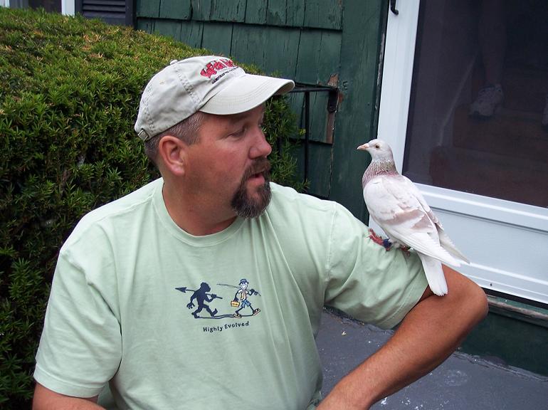 So I go to use our outside shower yesterday and sitting in front of it is this homing pigeon! He takes one look at me and walks over to my feet and starts checking me out! So I am talking to it and my son and I give it some feed and water and he hangs out for awhile and we go in the house figuring he would be off soon! Suddenly we look on our front steps and he is there looking for us at the screen door??? We go out and he just climbs up on me???? As you can see by pic #2.....he got real comfortable!!!  He was pretty cool......thats my son Larry holding him! The bird stayed all night on the railing at the back door like he was looking for us?? Very cool! He has moved on now! Nice visit! We tracked the tag on his foot to a club out of Braintree! I know they are trained and very "people friendly"....but this was funny!