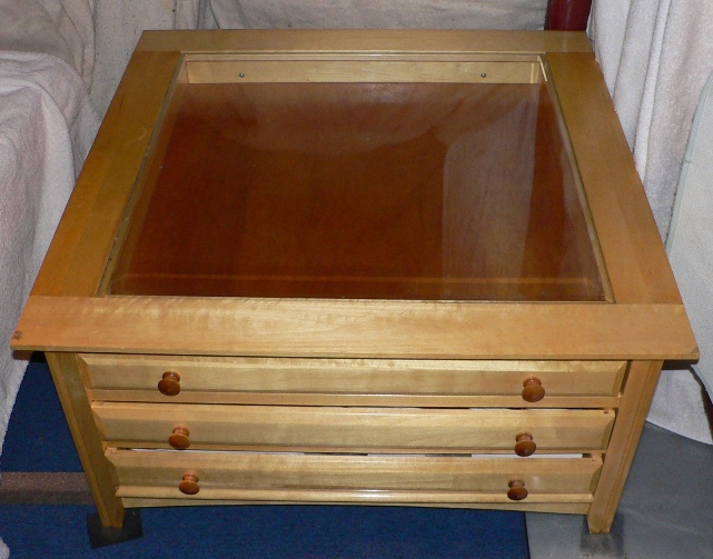 For Sale Square Hardwood Glass Top Curio / Chart Map Coffee Table With 3 Drawers