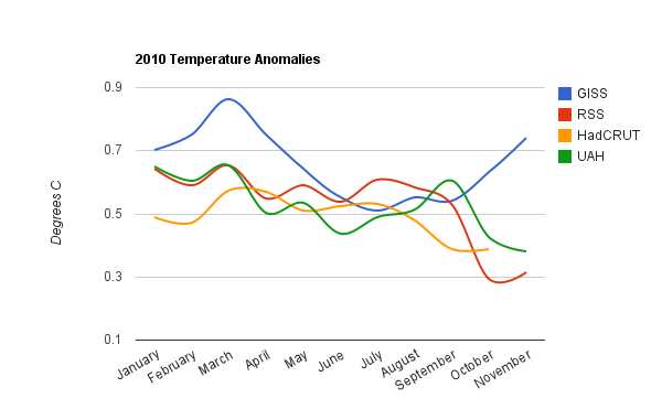 GISS also showed a huge spike in March which nobody else saw. Does this have anything to do with Hansen’s constant claims of 2010 as the hottest year ever? He shows peak La Niña temperatures almost as warm as peak El Niño temperatures. That is simply ridiculous." Steven Goddard