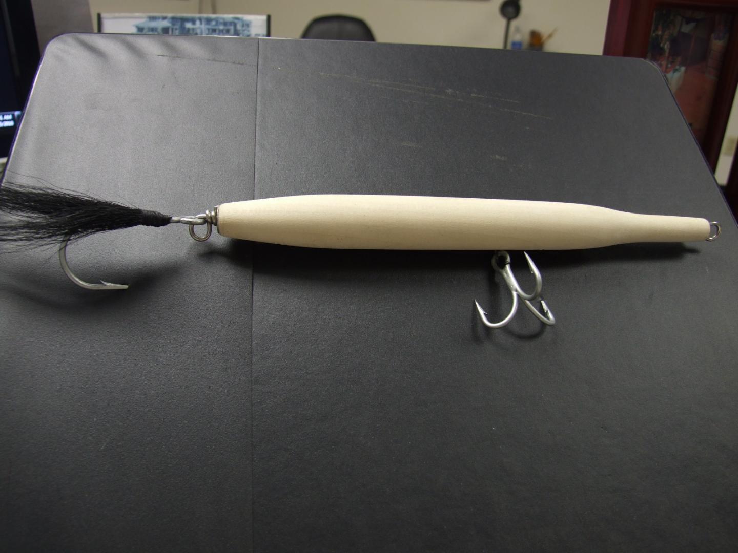 This needle is a copy of an old Gag's needle from the early-mid 1980's. The original was very light and tough to cast. I dupe'd the body out of maple, then inserted 18 grams of 1/4" lead into the body that extends about 3" up from the tail. Also, I added 6 grams just ahead of the front hook. The needle weights about 1.85 oz unfinished and swims almost like a lipped plug. Overall length is 7 1/4".