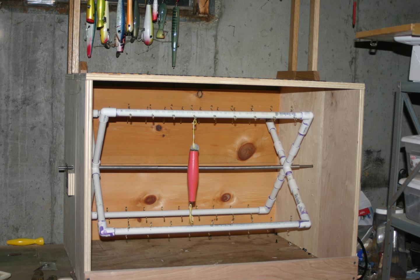 I just started building this spinner/drier. I was putting a piece of bailing wire with a loop on one end through the plug and hanging from a nail in the joist above the boiler. Now I am building this box to dry paint and epoxy. I have to insulate it and add the lighting for heat, then put the doors on. The doors are wood frame with plexi-glass. I don't know if I'm doing things right or wrong.....but I'm having a hell-of-a-time doing it.